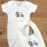100% Cotton Onesie & Bib. Super soft with Embroidery - sealed on inside for comfort on skin. Armenian Boy Motif of a shepherd with sheep. Comes packaged in a tule bag with ribbon as a 2 pc set. Matches the Armenian baby boy blanket. This set includes a onesie and a bib - PLEASE NOTE! Blanket is not included with this item. Must be purchased separately. Item come gift packed in a tule bag with ribbon and hang tag.