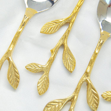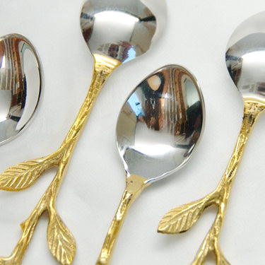 Indulge in luxury with our Leaf Dessert Spoons. Made with gold plated brass and stainless steel, these handcrafted spoons feature elegant gold leaf designs. The set of four is perfect for entertaining and adds a touch of sophistication to any dessert spread. Each spoon measures 5.5" long and 1" wide.