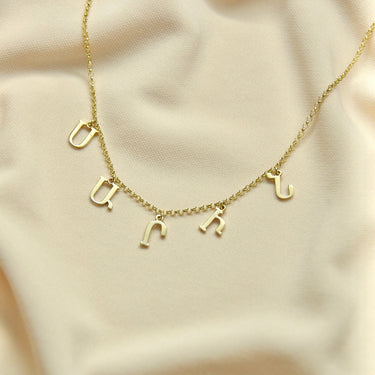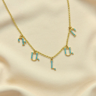 Our Armenian Custom Initial Necklace can be customized with a minimum of two and a maximum of five initials of your choice. The initial charms and box chain are made with 14K Gold. The initials come in your choice of solid gold or adorned with small turquoise stones.