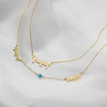 Our Armenian Two Name Necklace can be customized in any font and language. The pendant and dainty box chain are made with 14K Gold. The necklace is adorned with a small turquoise bead (optional)