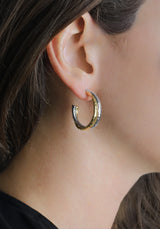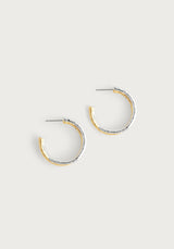 The Farrier Mixed Metal Hoop Earrings is a stunning piece crafted from 18k gold plated brass and Sterling Silver plated brass, designed to embody the rugged beauty and refined elegance of traditional farriery. Each earring features a distinctive hammered texture, echoing the artisanal marks left by a blacksmith's hammer, which gives the exterior a unique, tactile surface. These medium-sized hoops are versatile, perfect for making a statement in both everyday wear and special occasions. Secure closures ensure that these earrings are both practical and stylish, making them a beautiful blend of tradition and modernity.
