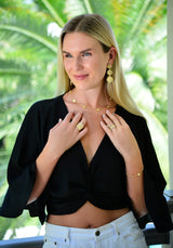 Crafted with meticulous attention to detail, these accessories offer a unique fusion of simplicity and statement style. All items are meticulously 18K gold plated brass, exuding a timeless allure that complements any outfit. To add a touch of brilliance, each piece is adorned with shimmering crystals, ensuring you radiate elegance and grace wherever you go.