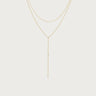Chic and delicate, the Double Layer Shimmery Lariat features two fine chains with a cascading drop that catches the light with every move. Designed for effortless elegance, it adds a touch of sparkle and sophistication to any neckline. Perfect for layering or wearing as a standalone statement.