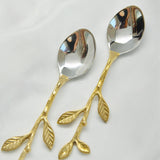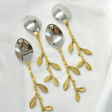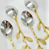 Indulge in luxury with our Leaf Dessert Spoons. Made with gold plated brass and stainless steel, these handcrafted spoons feature elegant gold leaf designs. The set of four is perfect for entertaining and adds a touch of sophistication to any dessert spread. Each spoon measures 5.5" long and 1" wide.