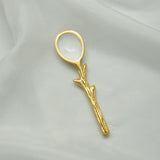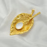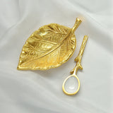 Indulge in luxury with our Mini Gold Leaf Dish w/ Spoon. Made with intricate handcrafted details, this gold-plated dish and white enamel spoon are perfect for adding the final touch of elegance to your table. The compact size, 3" long by 2" wide, makes it convenient for serving salt or pepper. Elevate your dining experience with this exclusive piece.