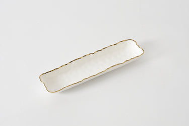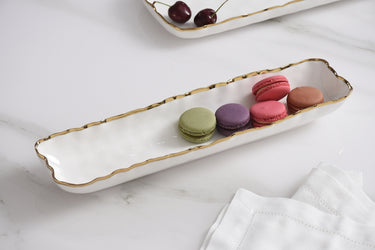 Elegant and understated, this cracker tray from our Portofino Collection is perfect for serving crackers, biscotti, small cookies, or bite-sized treats with style. Its slim profile makes it a beautiful addition to cheese boards, tea service, or appetizer spreads. Crafted from crisp white porcelain and accented with a delicate gold trim, it brings a touch of timeless sophistication to any occasion. Food safe, tarnish-free, dishwasher safe, and oven safe up to 500°F, it’s as practical as it is beautiful—designed for effortless entertaining and easy care.