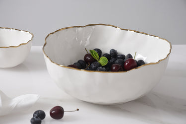 Perfectly sized for individual portions, this medium bowl from our Portofino Collection is ideal for serving pasta, salads, chips, or your favorite comfort foods. Its classic shape and refined design make it suitable for everyday dining or elegant entertaining. Crafted from luminous white porcelain and finished with a delicate gold trim, it brings timeless beauty to the table. Food safe, tarnish-free, dishwasher safe, and oven safe up to 500°F, it offers a seamless blend of sophistication and easy care.