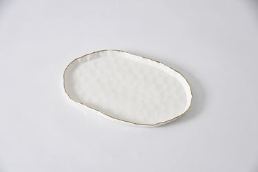 Add elegance and versatility to your serveware collection with this medium oval platter from our Portofino collection. Ideal for presenting smaller main courses, generous sides, or a beautifully arranged dessert selection, this platter transitions seamlessly from the dining table to casual gatherings. Its graceful oval shape and moderate size also make it a stylish decorative tray for coffee tables, buffets, or entryways. Made from luminous white porcelain and finished with a fine gold trim, it brings a sophisticated touch to any setting. Designed for both beauty and function, it is food safe, tarnish-resistant, dishwasher safe, and oven safe up to 500°F. Durable, refined, and easy to care for—this piece is perfect for both everyday use and special occasions.