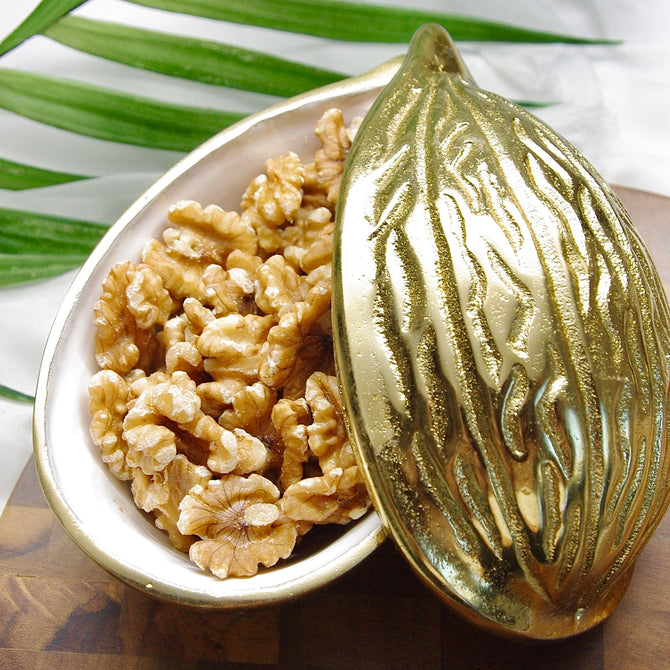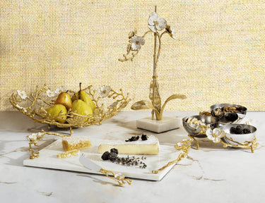 The Michael Aram Orchid Triple Bowl lends opulence and exquisite beauty to any home. This luxe hand-textured stainless steel and natural brass bowl is adorned with a vibrant white enamel finish and a graceful, sensuous orchid motif that symbolizes peace and harmony. Perfect for holding candy, nuts, or other food items, this beautiful bowl also serves as a stunning accent piece for your luxury home decor. Measuring 9" in length, 9" in width, and 3.75" in height, its timeless design and exquisite craftsmanship make it a unique and stunning addition to any home.